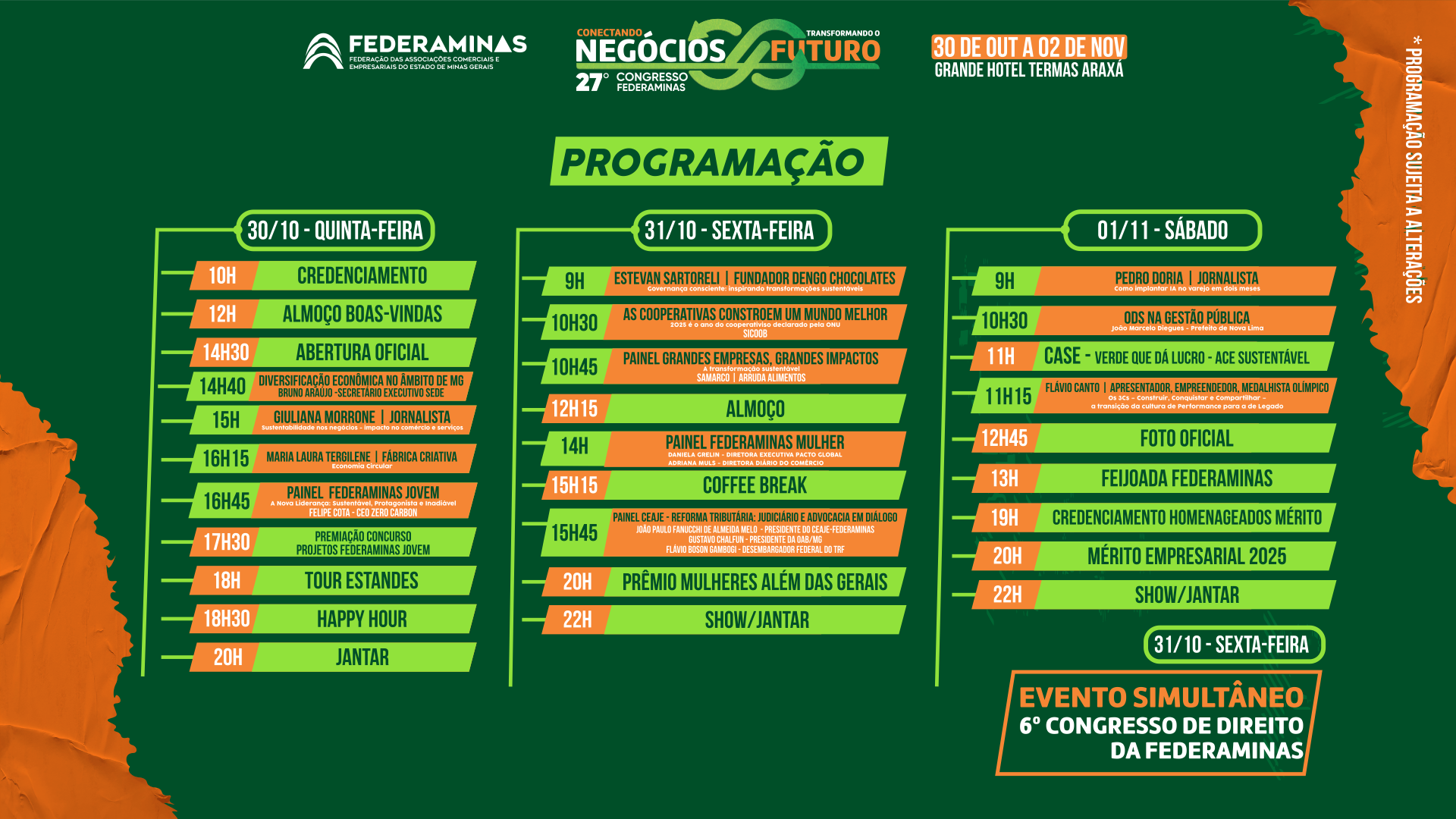 - Substituição de participante, em até 10 dias de antecedência, desde que seja do mesmo sexo para melhor acomodação.